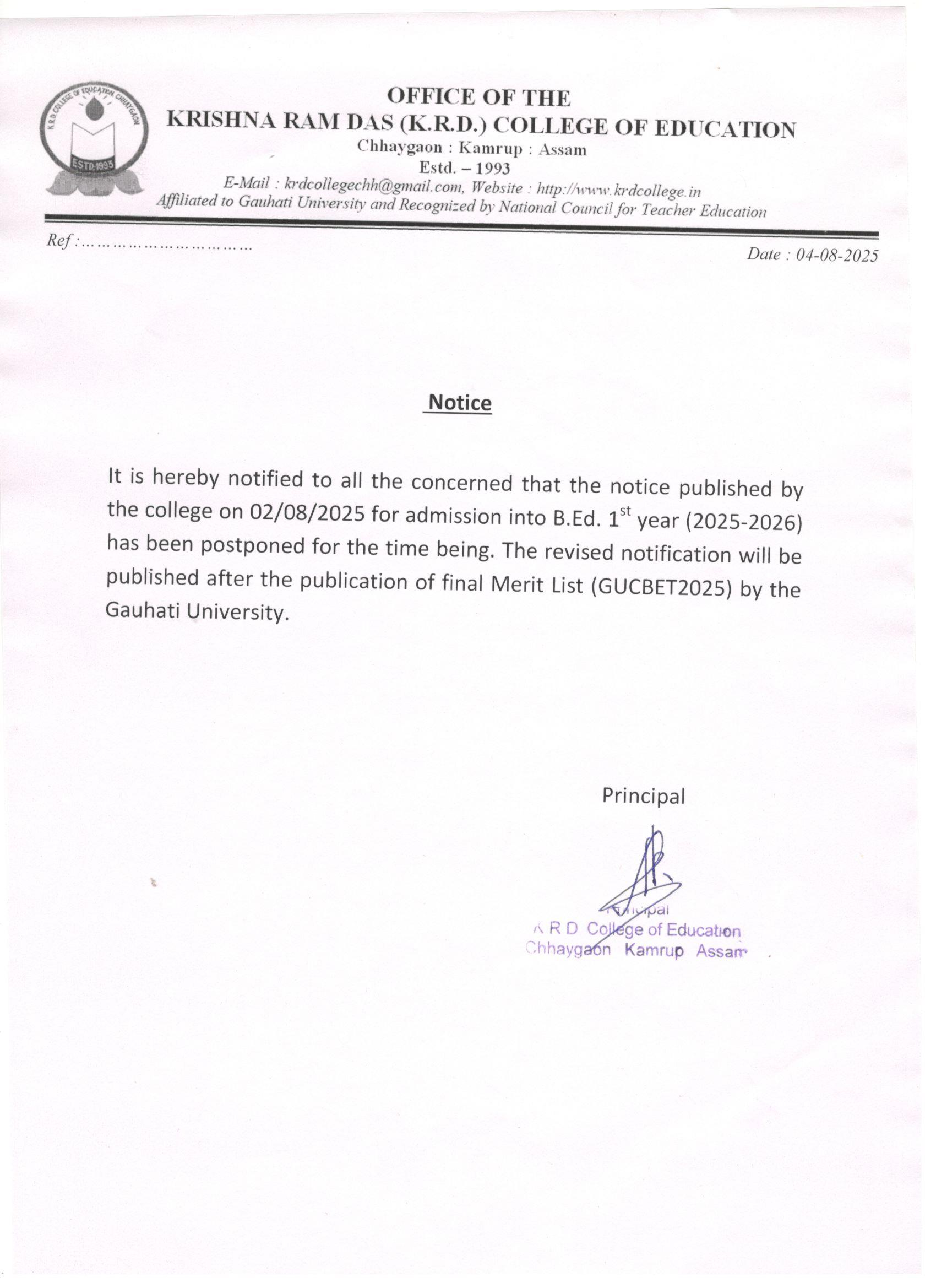 Admission Postponed Notice, B,Ed. First Year, 2025
